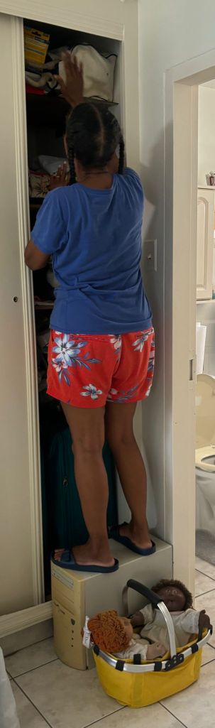 On the “I doh like clutter tip” this woman also uses a computer tower – Yes! I said a computer tower as a stool, for the linen cupboard, that takes up much more room than a foldable stool, and the weight of moving it. On top of said computer tower live my and E’s cabbage patch dolls chilling together in a yellow basket, please note, we are now 43 and 46 respectively, we both moved out of the house in 1998 in our teens – wwwwhhhhyyyyyy are the cabbage patch dolls still here? I am keeping them doh but that computer tower has to go!